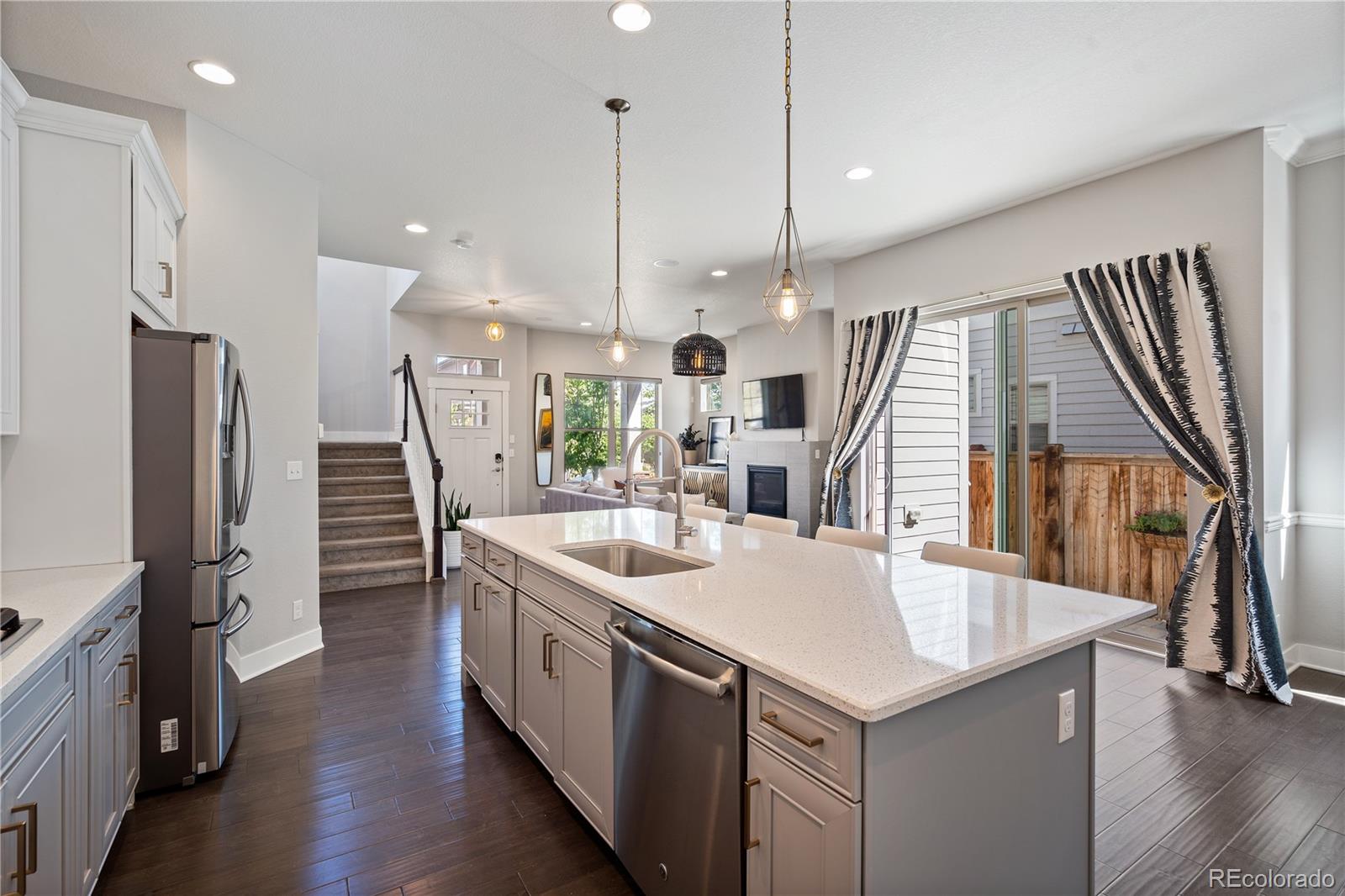 Luxurious finishes abound in this stunning 4 bedroom, 3.5 bath immaculate home with a finished basement and 2-car attached garage in Central Park's Beeler Park neighborhood. Just blocks from Splash Landing Pool, Shops at Beeler, the soon to open Pearl Market, this beautifully curated home welcomes you in with a quintessential porch swing, ready for afternoons of relaxing the day's cares away. The main floor begins the home's impressive greeting with high ceilings, warm wood floors and a thoughtful open floor plan. An elegant living room beckons you with a cozy fireplace and gorgeous lighting. The idyllic kitchen rests at the heart of the living and dining rooms, destined to be where loved ones come to gather around the large white quartz island. Bright and stylish with white subway and soft-close white & grey tuxedo cabinetry, this chef's kitchen offers all the essentials including stainless steel appliances, a 5-burner gas range & hood, wall oven and pantry. The dining room boasts elegant trim and a 8-light chandelier. Follow the glass door outside for a perfect dining al fresco option on the extended paver patio and low maintenance pet-grade turf yard. A mudroom and powder bath round out the main level. Make your way upstairs to the primary retreat with a 5-pc ensuite bathroom with *heated floors* ready to warm you right up! The suite's 12-foot walk-in closet will be the envy of all your friends! Two additional bedrooms, a laundry closet with included washer/dryer, as well as a full hall bath complete the second floor. The finished basement includes a spacious family/media room with built-in speakers, a workout space, an additional large bedroom and a full bathroom. With beautiful finishes and the perfect neutral color scheme - there's no work left to do! With miles of hiking and biking trails as well as the green open spaces of Rocky Mountain Wildlife Refuge, come enjoy the best Colorado has to offer! Quick commute to Downtown, DIA, and Anschutz Medical Complex!